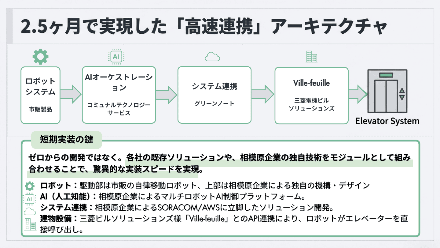 ロボットの上部・下部ユニット、庁舎のエレベーター連携システム(グリーンノート様クラウドシステム、三菱電機ビルソリューションズ様「Ville-feuille」)、職員用操作画面、市販のロボットシステムなど、異なる仕様のシステムを「Buddiotte」がハブとなって統合制御しています。ゼロからの開発ではなく、既存モジュールを組み合わせる「高速連携アーキテクチャ」により、約2.5ヶ月という短期間での社会実装を実現しました。